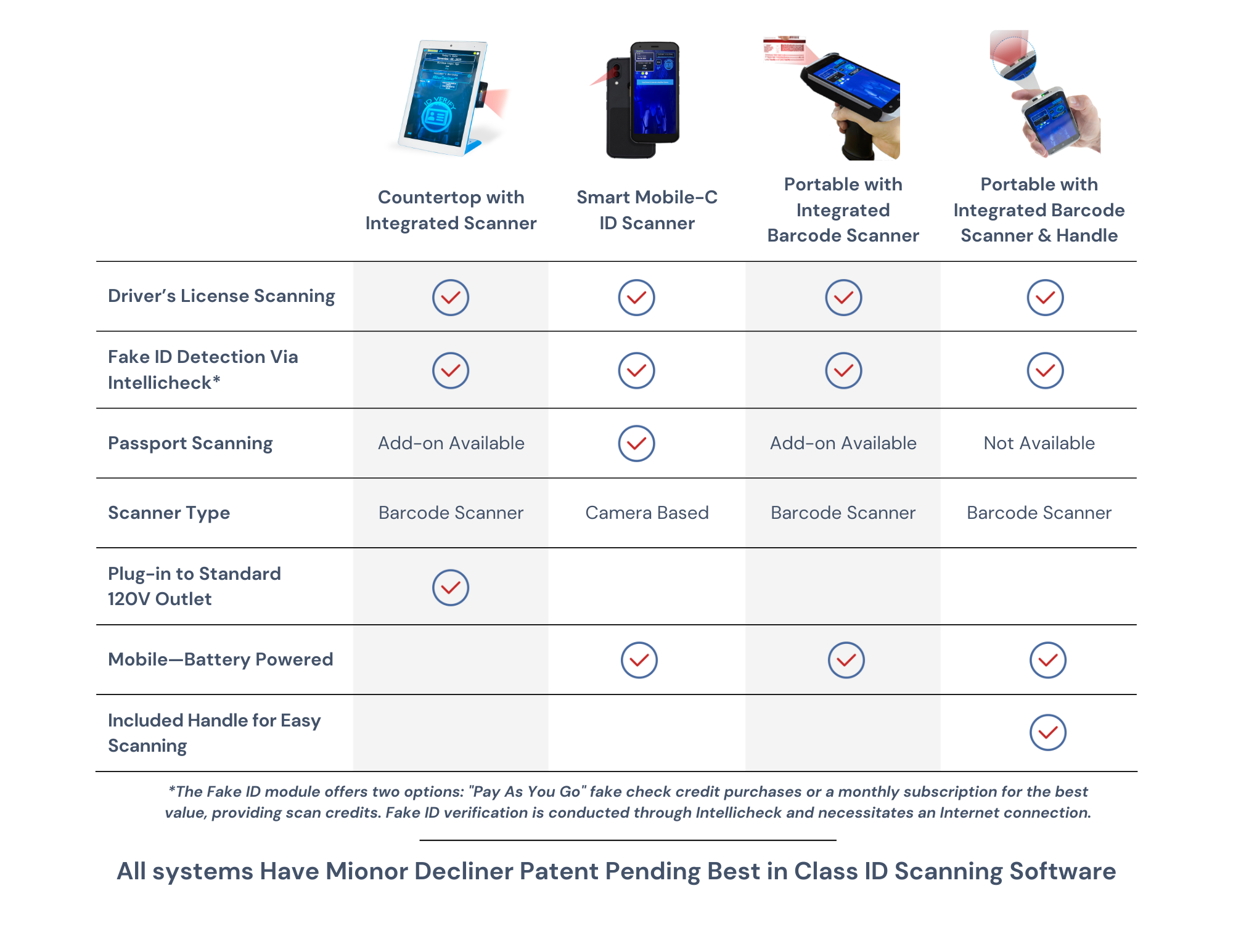 Countertop ID Scanners for quick sale / no sale flagging, compliance logging, and with optional fake ID detection. Minor Decliner's ID scanner at your entry door verifies age, improves security, and denies entry to underage customers.