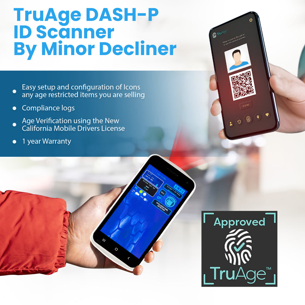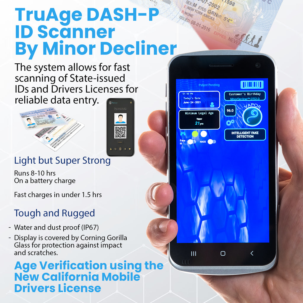 The Minor Decliner TRUAGE and California Mobile Driver's license ready Portable Smart ID Scanner is simple to use. This is a light but super strong handheld tablet with an integrated scanner. It is slim - only 11mm thick and very light weight - only 6 oz. However, this is a Tough and Rugged table. It is designed to master rough tasks and environments. It is water and dust proof (IP67) The display is covered by Corning Gorilla Glass for optimal protection against impact and scratches. This has a long battery life on a changing, working 8-10 hours for a shift before a charge is needed. It is fast charging, charging to full strength in under 1.5 hrs. This high-quality age verification machine detects expired IDs and underage consumers. This driver's license scanner is the ideal product to increase your employees' efficiency, help check IDs properly, and reduce the "human error" factor. This system is ready to go now to read both Drivers licenses and the new California Mobile Driver's License.